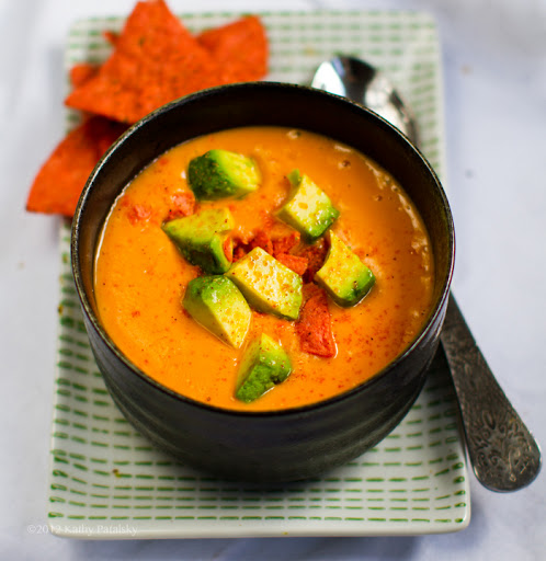 3. Remove potato skin, add to blender along with the broth and non-dairy milk. Blend on low until smooth. Taste a drop to see that it is slightly bland at this point. Add the salt and spices to taste. I added the zest last and folded it into the poured soup.