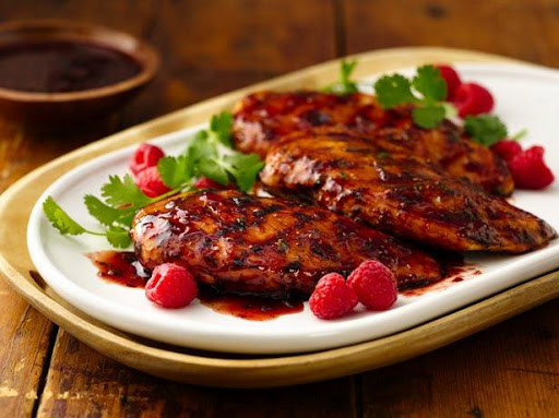 Heat any remaining glaze to boiling; boil and stir 1 minute. Serve chicken with glaze and fresh raspberries.