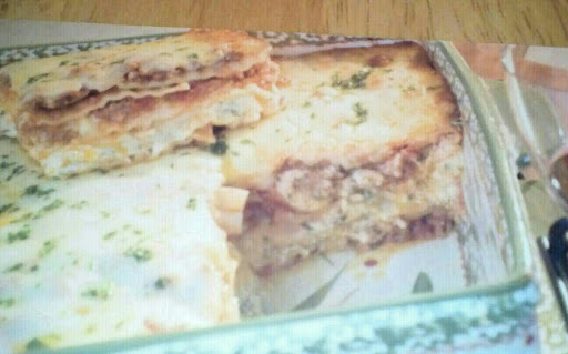 3.In 13x9 baking dish;spread 1/4 of the meat sauce;evenly over bottom of pan.Layer one pasta over sauce.Spread 1/3 of ricotta mixture over pasta;sprinkle with 1/3 mozzarella and 1/3 of parmesan cheese,repeat layers of pasta,ricotta mixture,cheeses,and meat sauce.