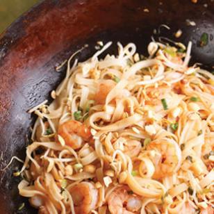 3.Drain the noodles and add to the wok, tossing with tongs until they soften and curl, about 1 minute. Add bean sprouts, scallion greens, vinegar, fish sauce, sugar and chile-garlic sauce; toss until the shrimp are fully cooked and noodles are heated through, 1 to 2 minutes. Sprinkle with peanuts and serve immediately.