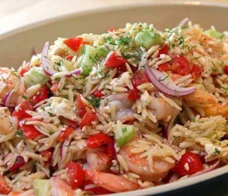 Sprinkle the shrimp with salt and pepper. In a large skillet, heat the remaining 1 tablespoon oil over medium-high heat. Add the shrimp to the skillet and cook, stirring, until the shrimp are no longer pink, 2 to 3 minutes. Remove from the heat and sprinkle the shrimp with a little lemon juice. Add the shrimp to the orzo and toss. Taste the salad and season with more salt and pepper if desired.