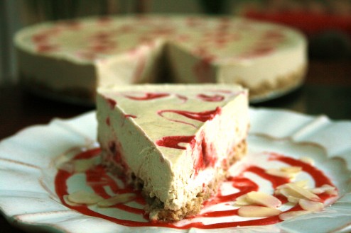 Pour half of the filling into the pie crust. Tap the pie on the counter to release any air bubbles. Dot the surface of the filling with the strawberry sauce and swirl the filling with a chopstick or knife. This part of the filling will not be visable, so it can be your trial run. Pour the remaining filling into the pie crust and again tap the pie and dot the top with the strawberry sauce. If you are using a regular pie plate you will have extra filling. Swirl the top and place in the freezer to set for 2 hours and then keep in the fridge until ready to serve. Serve the slices with extra strawberry sauce and sliced almonds if desired.