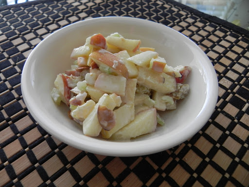 Used all Gala apples. Had plain Greek yogurt so I added about 2t. honey and a bit of vanilla. Since I didn't think I had enough of the yogurt I added a small "plop" of Miracle Whip. Toasted almonds, too. Nice refreshing salad. Can't wait to defrost some Costco Rotisserie chicken for lunch tomorrow.