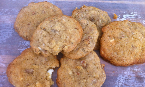 Beat butter and sugars until fluffy. Add eggs, one at a time, and beat well. Add vanilla and banana. Add flour, cornstarch, salt and soda. Mix well. Add chocolate and pecans. Mix gently. Chill dough about 1 hour. Using a small ice cream scoop, drop dough onto baking sheet. Sprinkle with coarse salt. Bake 15 minutes or until browned on edges.