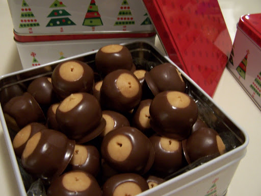 Mix together butter, peanut butter and powdered sugar (use hands to do it well). Form into small balls and freeze. Melt chocolate in microwave oven according to package directions. Dip frozen balls in dipping chocolate (using a toothpick) until almost covered. Make it look like a buckeye. Place on a waxed paper covered cookie sheet. Freeze for one hour and then store in a plastic bag. Makes 200 buckeyes.