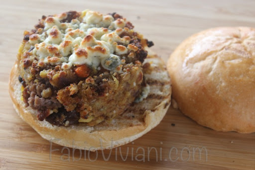 Form mixture into patties and fry in a hot pan with a touch of oil. Cook until both sides are golden brown. Serve on buns with blue cheese.