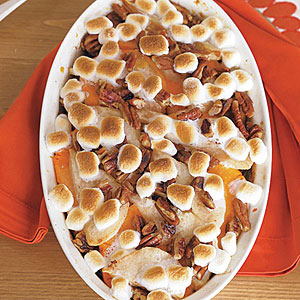 Drain sweet potatoes reserving syrup. Mash sweet potatoes with potato masher. Mix sugar and melted butter and some syrup with potatoes. Put in casserole and sprinkle mini-marshmallows and chopped pecans. Bake at 350 for 45 minutes.
