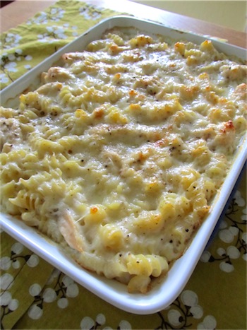 Remove pot from heat and gradually stir in cheeses. Add chicken and pasta to pot. Season with salt & pepper to taste.