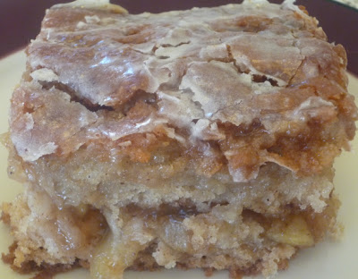 While the cake is baking, make the glaze. In a bowl, mix the powdered sugar, vanilla, and milk until the glaze is desired consistency. When the cake comes out of the oven, immediately but carefully pour onto hot cake. Try to pour as evenly as possible. You might have to pick up the cake and tilt it to spread the glaze evenly. I even poured some out that pooled at the corners and repoured that over the top. Let the cake sit for awhile for the glaze to set.