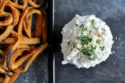 Garlic Butter Sweet Potato Fries with Creamy Feta Dip
