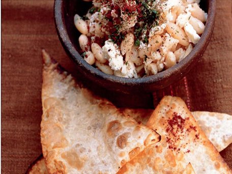 Meanwhile, place the garlic on a small baking sheet, drizzle with a little olive oil and roast until soft, about 45 minutes. Cool, then squeeze the garlic out of its skin and add to the mashed beans. Stir half the olive oil into the bean mixture. Mix in the lemon zest and juice. Then add the feta, mint and cumin, stirring until you have a rough chunky puree, and season.