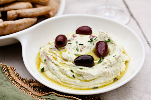 To serve, drizzle another tablespoon of olive oil on top and serve with pita wedges and olives.