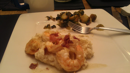 Serve shrimp and sauce over mashed cauliflower. Garnish with chopped bacon.