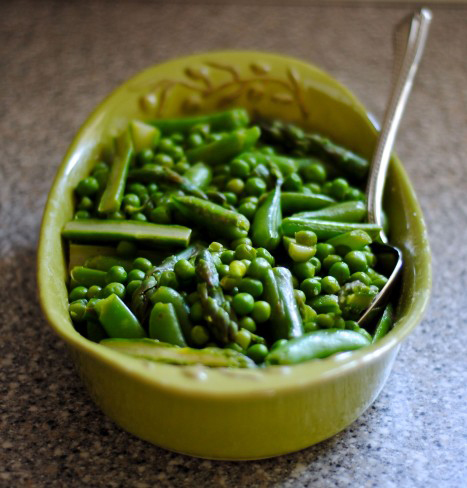 Add the snap peas and asparagus to the pot of boiling water. Boil for 30 seconds. Scoop out of the boiling pot and immediately dump them into the strainer in the ice bath. Allow them to cool in there for a few minutes.