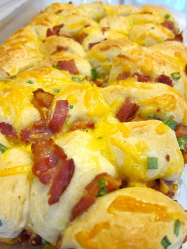 Separate dough into 8 biscuits; cut each into quarters. Gently stir biscuit pieces into egg mixture to coat evenly. Fold in bacon, cheese and onions. Spoon mixture into sprayed dish; arrange biscuit pieces in single layer.