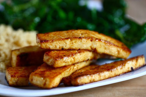 Drench each piece of tofu in the sauce ingredients then lay flat on the baking sheet. Bake for 30 minutes, flipping each piece of tofu midway through.
