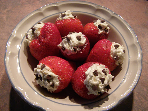 Pipe or use knife to fill cavity of strawberry with cream cheese mixture. Top with mini chocolate chips and chill for a minimum of