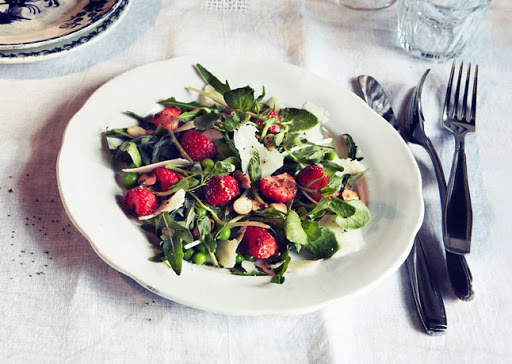 Add arugula, strawberries, pea tendrils, peas, and almonds to vinaigrette; toss to coat. Top with Parmesan.