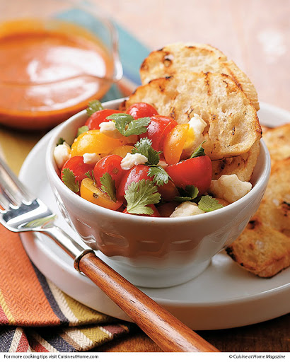 Toss together tomatoes, queso, cilantro, and scallions. Drizzle vinaigrette over salad to taste; serve with ciabatta.