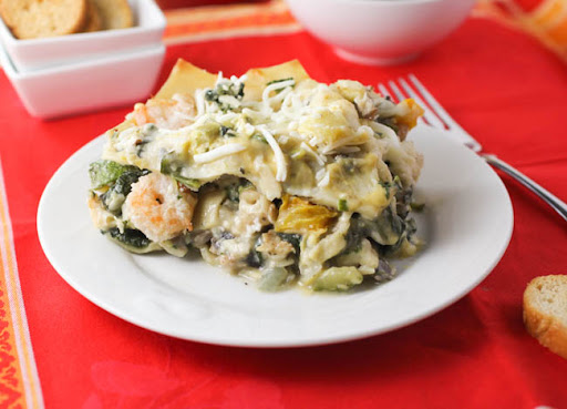 Spread ½ cup sauce in bottom of a 13 x 9-inch baking dish coated with cooking spray. Arrange 4 noodles, slightly overlapping, over sauce; top with one-third goat cheese mixture, one-third crab mixture, ⅔ cup sauce, and ⅔ cup mozzarella. Repeat layers twice, ending with mozzarella. Bake at 375° for 40 minutes or until golden. Let stand 15 minutes. Sprinkle with parsley.