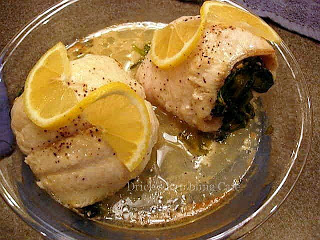 Drain milk from fillets and pat dry with paper towels. Place one fillet in baking dish and lightly sprinkle with pepper. Add a slice of cheese in the center and add one-fourth of the spinach mixture on top of the cheese. Roll up the fillet and secure with a toothpick. Place seam side down in dish and repeat until finished rolling all fillets.