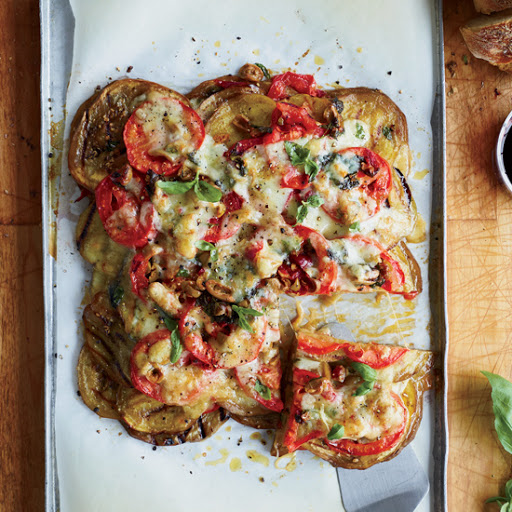Preheat the oven to 450° and heat a grill pan. Brush the eggplant and tomato slices with olive oil and season lightly with salt. Grill the eggplant in batches over moderately high heat, turning once, until softened and lightly charred, about 4 minutes. Grill the tomatoes, turning once, until lightly charred but still intact, about 2 minutes.