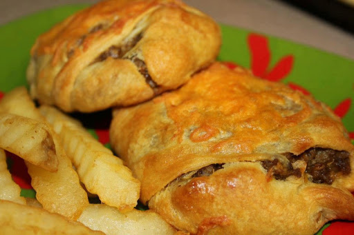 Brown and drain hamburger. In medium bowl mix hamburger and rest of ingredients (reserve 1/4 cup cheese for tops). Add a HEAPING spoonful of meat mixture to large end of unrolled crescent roll. Roll up and seal edges as best you can. Sprinkle reserved cheese on top and bake for 15 minutes til golden brown.