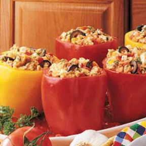 I cannot tell you how many times I have made these stuffed peppa's. So easy, delicious & filling! Got this recipe a few years ago out of a Taste of Home cook book. No matter what recipe I use I always improvise and add ingredients. This is EXACTLY how I make these Over Stuffed Peppa's. ENJOY!!!