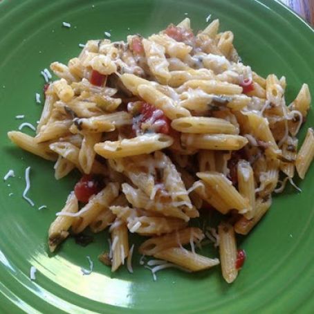 Boil up a box of penne pasta. Heat up a can of diced tomatoes and a jar of the chunky artichoke dip starter in a sauce pan. Drain pasta, combine and serve - we sprinkled some mozzarella cheese on ours too! A spicy, simple pasta dish!