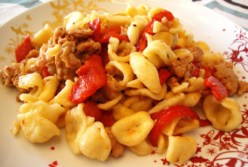 3. Meanwhile, heat the oil in a large skillet over medium-high heat. Cook the sausage, breaking it up with a spoon, until browned, 7 to 10 minutes. Add the roated peppers; cook until heated through.