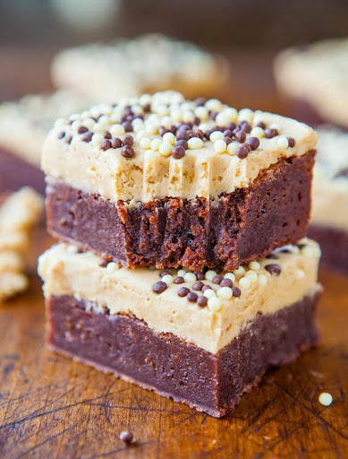 For the peanut butter buttercream: Combine peanut butter and butter in a large mixing bowl and beat on medium-high speed to soften and blend, about 2 minutes. Add the vanilla, 1 1/2 cups confectioners’ sugar, and optional salt (which cuts some of the sweetness), and beat to incorporate until frosting is smooth and fluffy. Add more confectioner's sugar based on desired thickness. (I use 2 cups so frosting is thicker and more paste-like.) Frost the brownies, add optional sprinkles, slice, and serve.