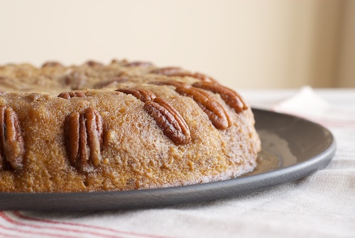 Bake 40-45 minutes, or until a wooden pick inserted in the center comes out clean. Run a knife around the edges of the pan to loosed cake. Turn cake onto serving dish immediately. Serve with Brown Sugar Brandy Sauce, if desired.