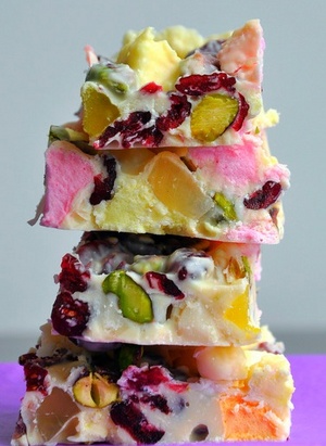 Roughly chop macadamias, marshmallows and candy and place in a glass or stainless steel bowl. Add the toasted pistachios and cranberries and mix gently.