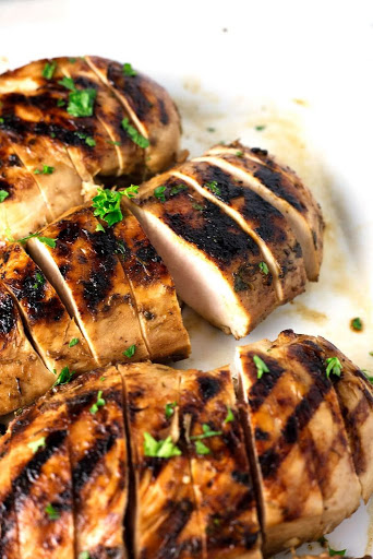 Preheat grill to medium-high heat. When hot, grab a chicken breast (one at a time) from the bag with tongs and shake off excess marinade into bag. Add to grill.