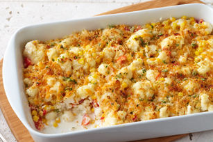 Place cauliflower in 13x9-inch baking dish sprayed with cooking spray. Add peppers, Cooking Creme and reserved cooking water; stir until vegetables are evenly coated with sauce.