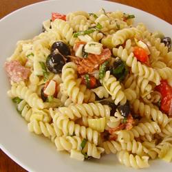 Mix fusilli, basil, salami, pepperoni, artichoke hearts, provolone cheese, Asiago cheese, olives, roasted red peppers, 1/2 teaspoon black pepper, and 1/4 teaspoon salt in a large bowl; drizzle vinaigrette over salad. Toss to evenly coat.