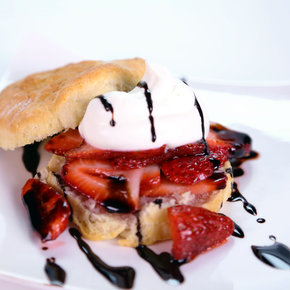 instructions Slice the biscuits in half and add a large spoon full of strawberries, a drizzle of balsamic vinegar and a large dollop of whipped cream. Add a final drizzle of vinegar to the top along with freshly cracked black pepper.