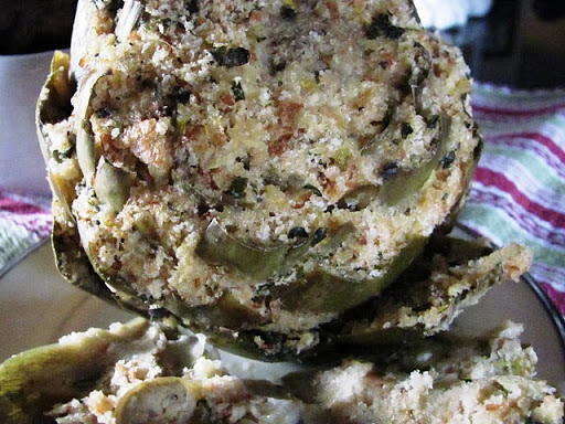 Place an artichoke in the bowl of stuffing, and using your hands, gently spread the outer leaves to stuff each leaf with stuffing. I use my fingers to scoop and stuff. Turn the artichoke as you stuff the leaves, going around until you reach the trimmed top of the artichoke.