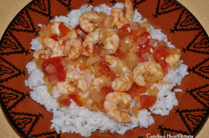Heat a skillet over medium-high and sauté the onion and garlic until soft. Add the seasonings, broth and can of diced tomatoes. Simmer until thickened (about 20 minutes). Add shrimp and stir until shrimp are cooked (about 5 minutes).