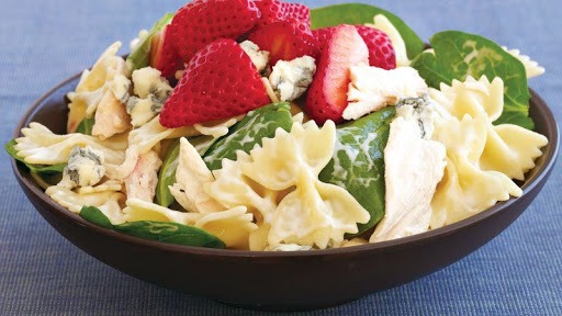 In large bowl, toss pasta and chicken. Just before serving, pour buttermilk dressing over pasta mixture and toss to combine. Add spinach and toss gently. Spoon salad onto serving platter; top with strawberries and cheese.