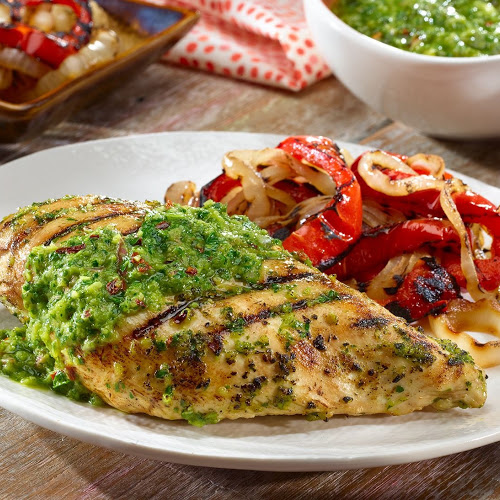 Transfer chicken to serving plates. Top with reserved chimichurri sauce; serve with grilled onions and peppers.
