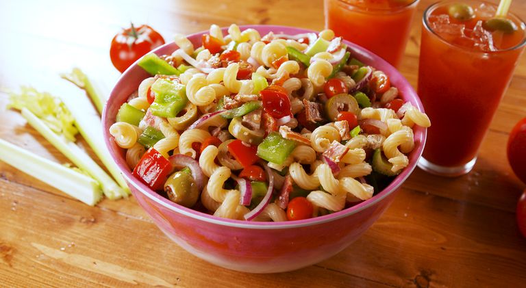 In a large bowl, combine pasta, bacon, celery, tomatoes, green bell pepper, red bell pepper, onion, mozzarella, and olives.