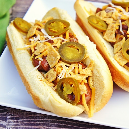 3. Place hot dogs onto the buns. Top with chili, shredded cheese, jalapeno slices, and crushed Frito chips.