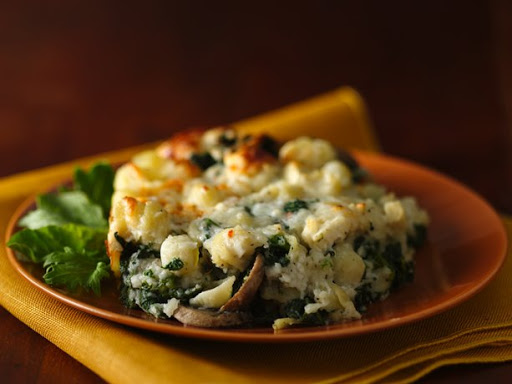 - 3 In large bowl, stir together pasta and spinach. Stir in mushroom mixture. Spread in baking dish. In large bowl, stir remaining ingredients until blended. Pour over spinach mixture.