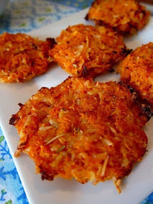 Peel sweet potatoes. Grate sweet potatoes and then squeeze the moisture from them. (I just used my hands to press out the liquid.) The more moisture you remove, the crispier they get in the oven.