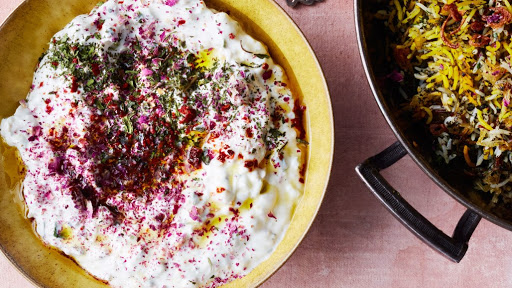 Mast, which translates to yogurt in Farsi, is a staple side dish on most Persian tables. The yogurt can be mixed with shallots, grated cooked beets, cooked spinach, or, most commonly, with Persian cucumbers, mint, and dried rose. Serve this with our herby rice recipe.