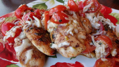 Meanwhile, in a small bowl combine basil, tomatoes, 1/4 cup of Italian dressing, and 1/2 cup of shredded mozzarella cheese.