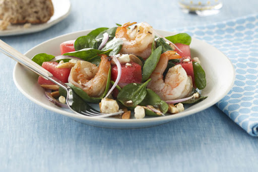 This isn't your typical spinach salad! Tossed with shrimp, watermelon chunks, feta cheese, red onions and crunchy almonds, this spinach salad is a culinary masterpiece.