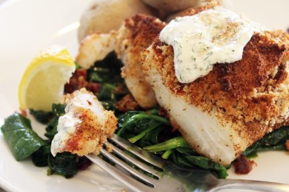 Top each piece with some bread crumb mixture, mashing it with your fingers to form a light crust. Bake the fish for 12-15 minutes until cooked through but not overdone.
