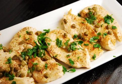 Pour wine, broth, and lemon juice all over the chicken, and then top with the capers.